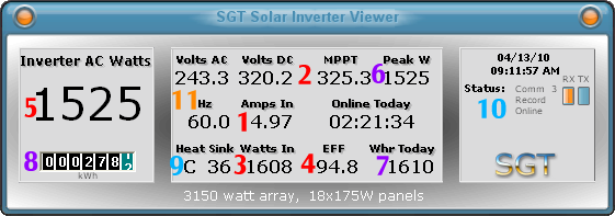 - Tenth is the current status display. This is where the current state of the inverter is shown, usually just online or offline. Sometimes you will see special messages in this area, such as when the maximum power input is reached, or the connection countdown at sunrise (the inverter takes five minutes to come online once it detects electrical current coming from the array).